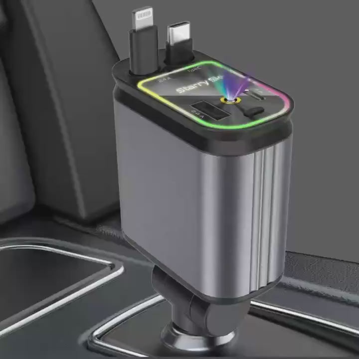 Chargez jusqu’à 4 appareils en même temps grâce aux câbles intégrés et ports USB.