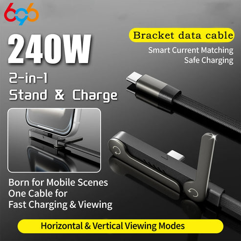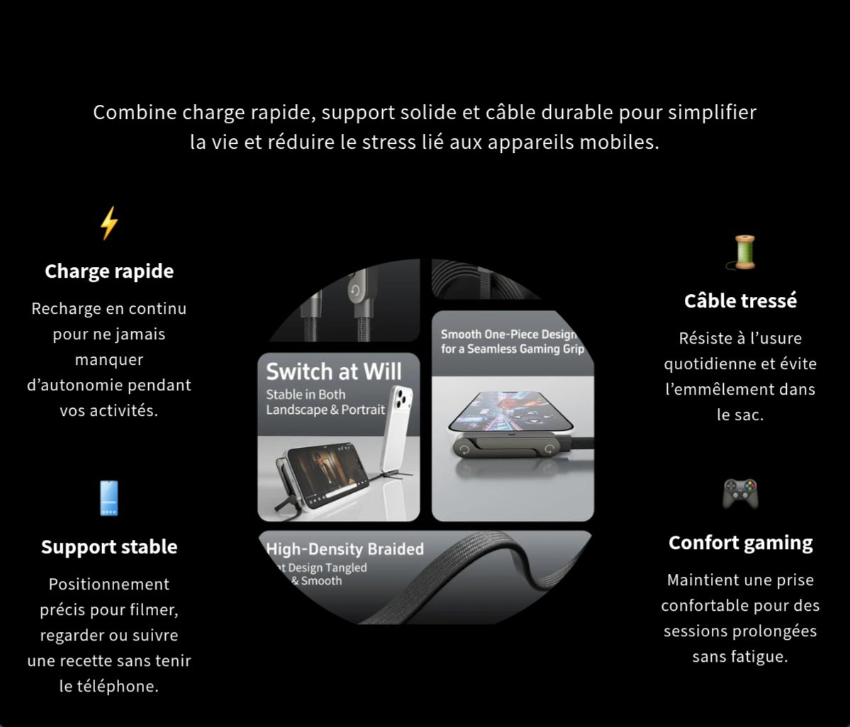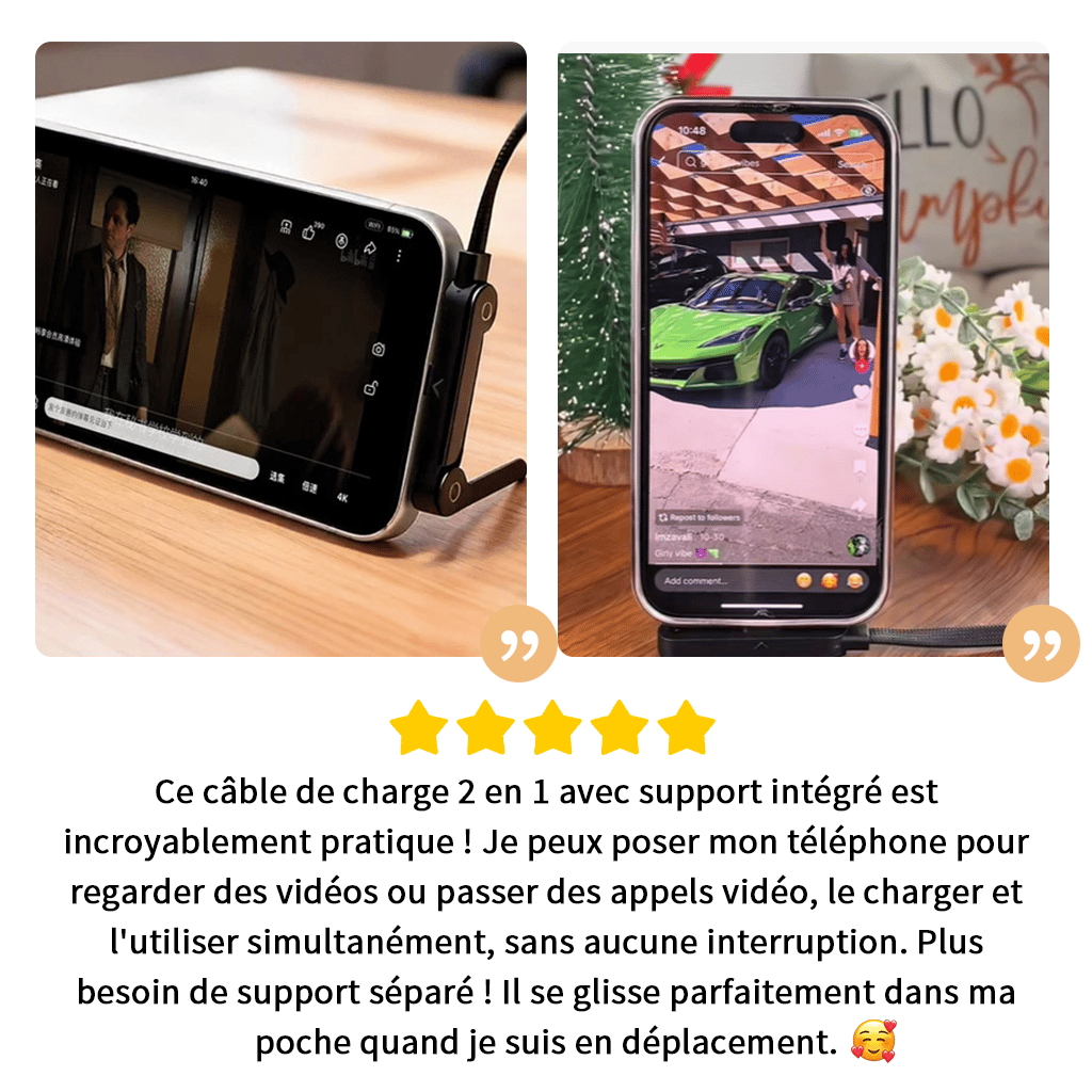 Ce câble 2-en-1 est conçu pour s'adapter parfaitement à votre style de vie moderne. Il combine la charge rapide et la fonction support dans un seul appareil. Grâce à sa conception compacte et à ses deux modes de visualisation (horizontal et vertical), il est idéal pour regarder des vidéos ou utiliser votre téléphone tout en le chargeant. Le câble est également compatible avec les smartphones et autres appareils mobiles, offrant une solution pratique pour les utilisateurs en déplacement.